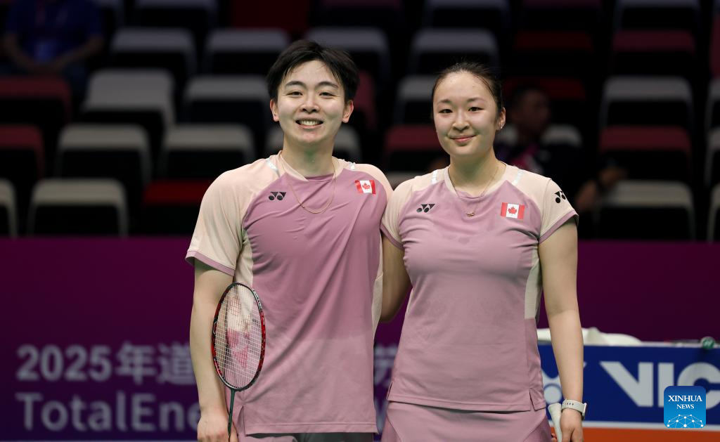 Kevin Lee (L)/Eliana Zhang of Canada compete in the mixed doubles match against Ondrej Kral/Tereza Svabikova of the Czech Republic during the group B match between Canada and the Czech Republic at BWF Sudirman Cup in Xiamen, southeast China's Fujian Province, April 30, 2025. (Xinhua/Wang Kaiyan)
