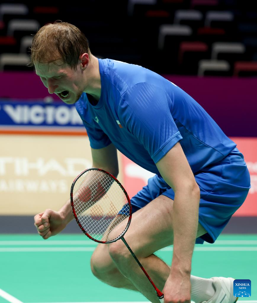 Jan Louda of the Czech Republic celebrates scoring in the men's singles match against Brian Yang of Canada during the group B match between Canada and the Czech Republic at BWF Sudirman Cup in Xiamen, southeast China's Fujian Province, April 30, 2025. (Xinhua/Wang Kaiyan)