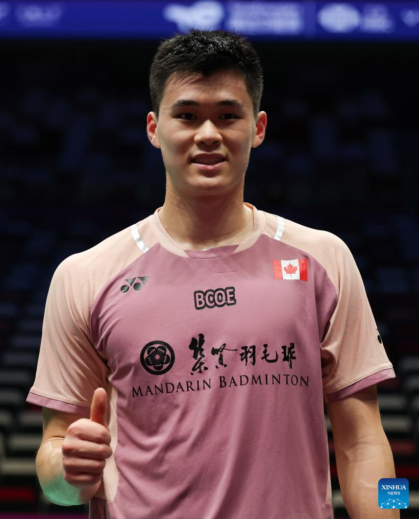 Brian Yang of Canada celebrates after winning the men's singles match against Jan Louda of the Czech Republic during the group B match between Canada and the Czech Republic at BWF Sudirman Cup in Xiamen, southeast China's Fujian Province, April 30, 2025. (Xinhua/Wang Kaiyan)