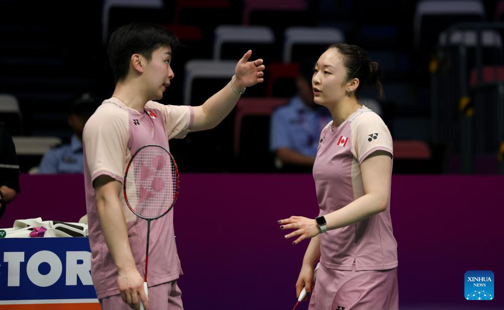 Kevin Lee/Eliana Zhang (R) of Canada communicate in the mixed doubles match against Ondrej Kral/Tereza Svabikova of the Czech Republic during the group B match between Canada and the Czech Republic at BWF Sudirman Cup in Xiamen, southeast China's Fujian Province, April 30, 2025. (Xinhua/Wang Kaiyan)