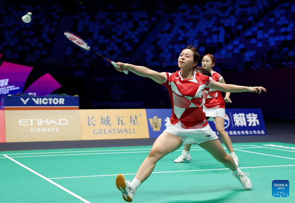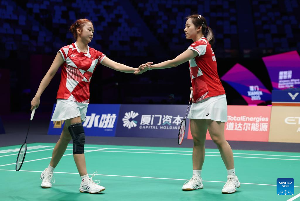 Liu Shengshu/Tan Ning (R) of China compete in the women's doubles match against Supissara Paewsampran/Jhenicha Sudjaipraparat of Thailand during the Group A match between China and Thailand at BWF Sudirman Cup in Xiamen, southeast China's Fujian Province, April 30, 2025. (Xinhua/Sun Fei)