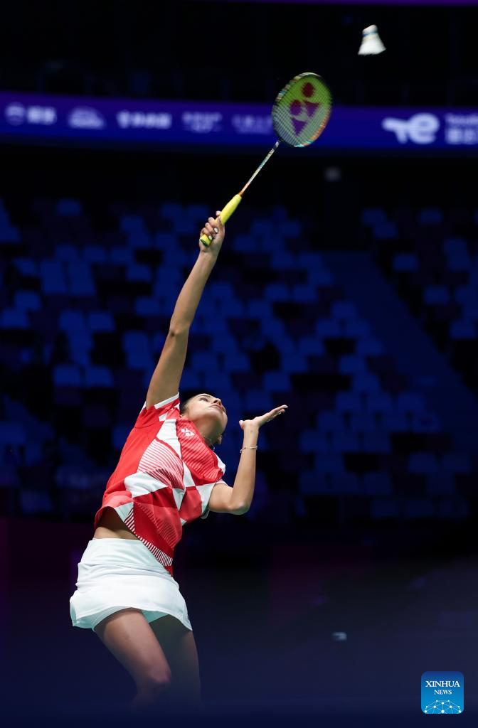 Wang Zhiyi of China competes in the women's singles match against Ratchanok Intanon of Thailand during the Group A match between China and Thailand at BWF Sudirman Cup in Xiamen, southeast China's Fujian Province, April 30, 2025. (Xinhua/Wang Kaiyan)