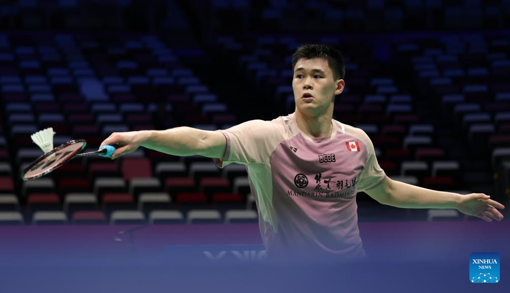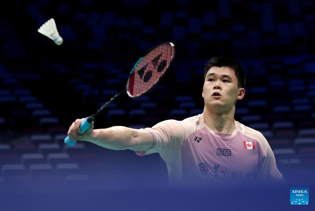 Brian Yang of Canada competes in the men's singles match against Jan Louda of the Czech Republic during the group B match between Canada and the Czech Republic at BWF Sudirman Cup in Xiamen, southeast China's Fujian Province, April 30, 2025. (Xinhua/Wang Kaiyan)