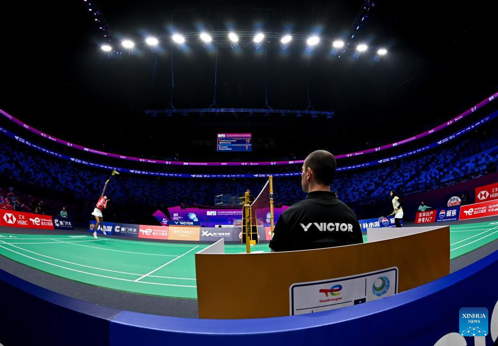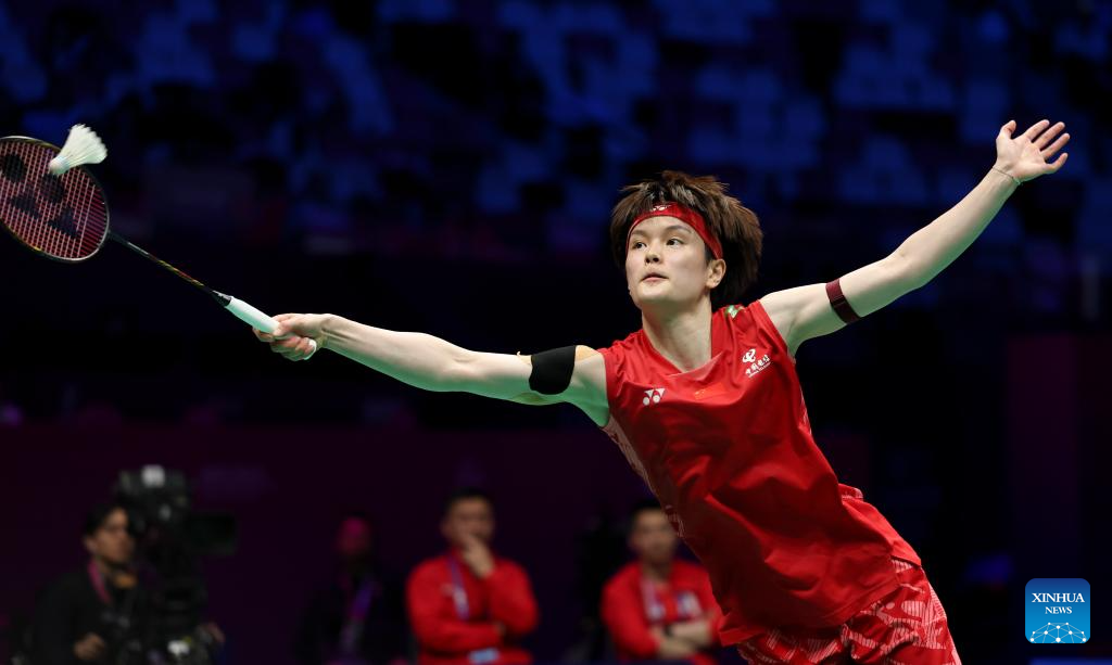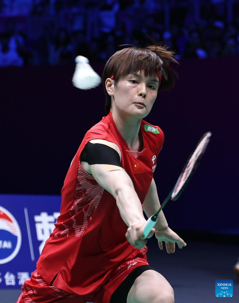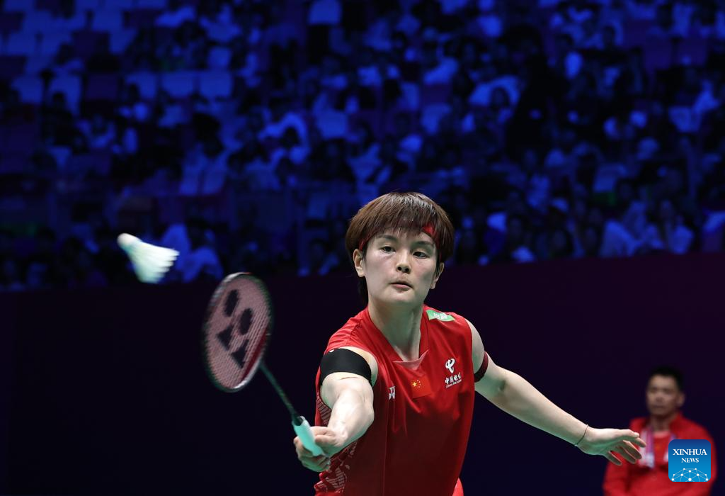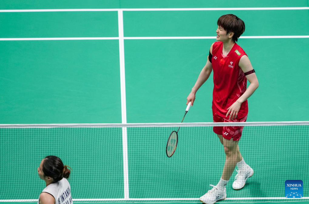 Wang Zhiyi of China competes in the women's singles match against Ratchanok Intanon of Thailand during the Group A match between China and Thailand at BWF Sudirman Cup in Xiamen, southeast China's Fujian Province, April 30, 2025. (Xinhua/Wei Peiquan)
