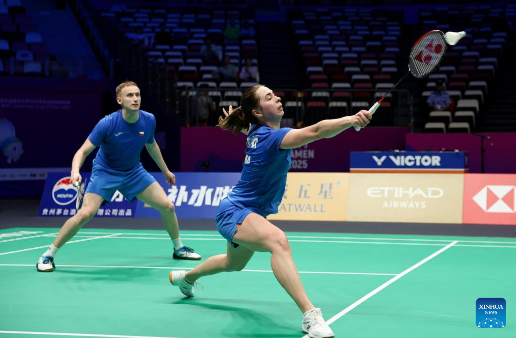 Ondrej Kral/Tereza Svabikova(R) of the Czech Republic compete in the mixed doubles match against Kevin Lee/Eliana Zhang of Canada during the group B match between Canada and the Czech Republic at BWF Sudirman Cup in Xiamen, southeast China's Fujian Province, April 30, 2025. (Xinhua/Wang Kaiyan)
