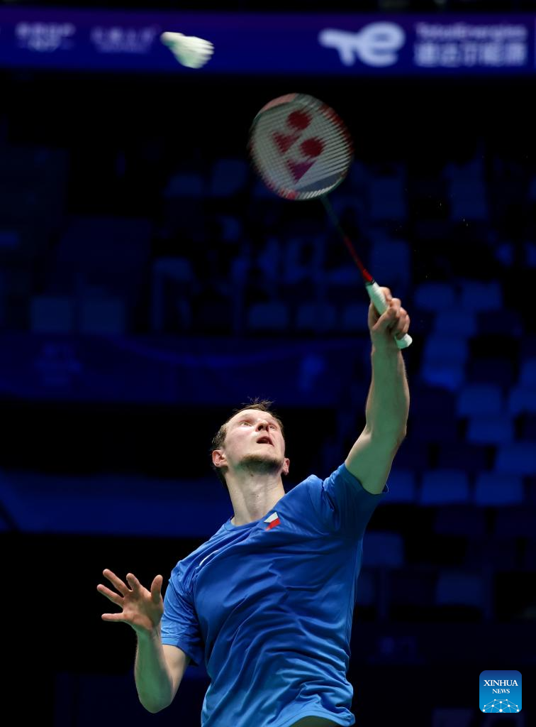 Jan Louda of the Czech Republic competes in the men's singles match against Brian Yang of Canada during the group B match between Canada and the Czech Republic at BWF Sudirman Cup in Xiamen, southeast China's Fujian Province, April 30, 2025. (Xinhua/Wang Kaiyan)