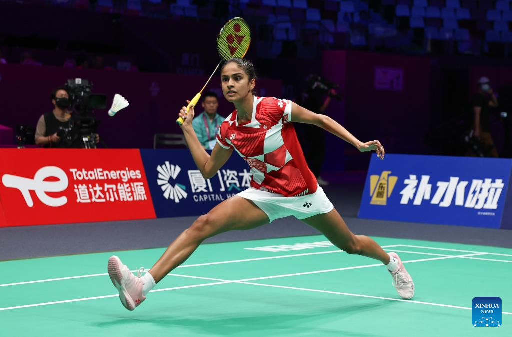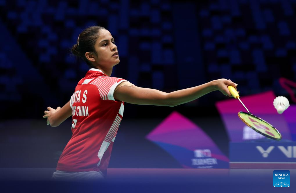 Mehta Saloni Samirbhai competes in the women's singles match between Mehta Saloni Samirbhai of China's Hongkong and Halla Bouksani of Algeria during the group A match between China's Hongkong and Algeria at BWF Sudirman Cup in Xiamen, southeast China's Fujian Province, April 30, 2025. (Xinhua/Wang Kaiyan)