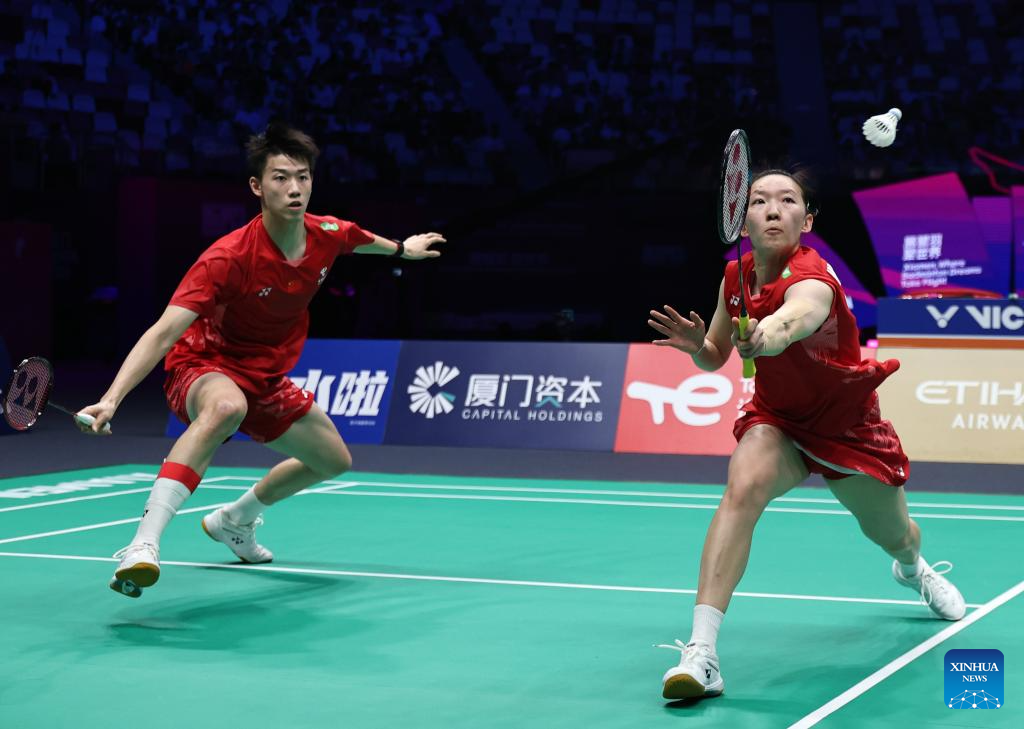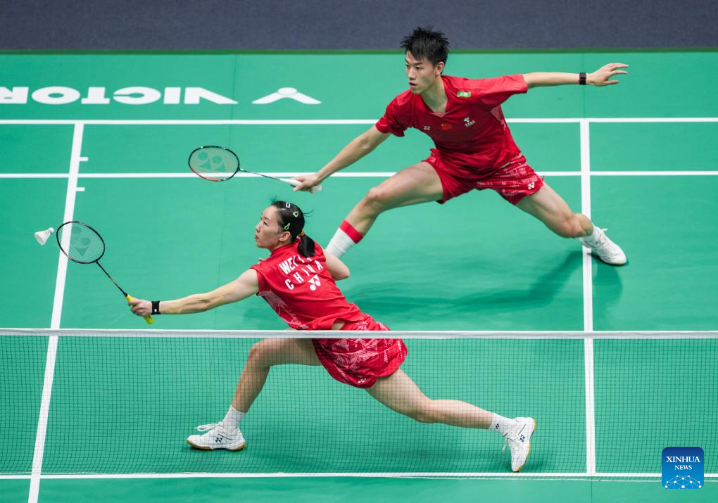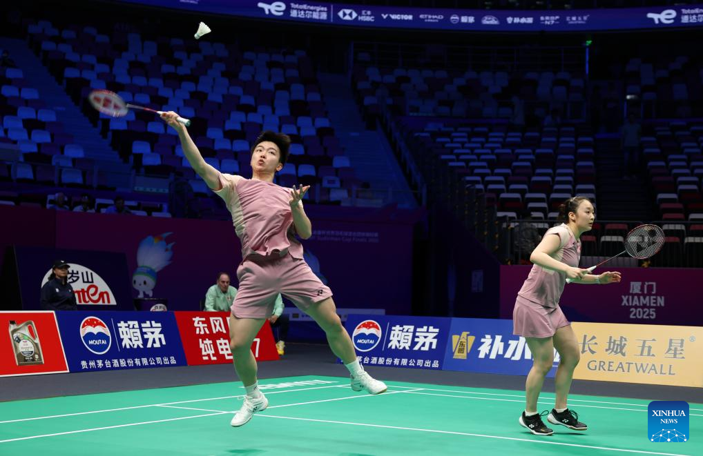 Feng Yanzhe/Wei Yaxin (R) of China compete in the mixed doubles match against Pakkapon Teeraratsakul/Phataimas Muenwong of Thailand during the Group A match between China and Thailand at BWF Sudirman Cup in Xiamen, southeast China's Fujian Province, April 30, 2025. (Xinhua/Wei Peiquan)
