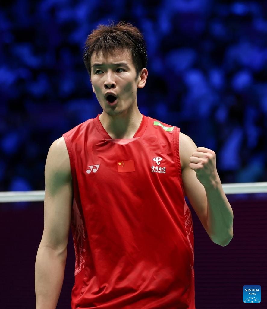 Li Shifeng of China celebrates in the men's singles match against Kantaphon Wangcharoen of Thailand during the Group A match between China and Thailand at BWF Sudirman Cup in Xiamen, southeast China's Fujian Province, April 30, 2025. (Xinhua/Wang Kaiyan)