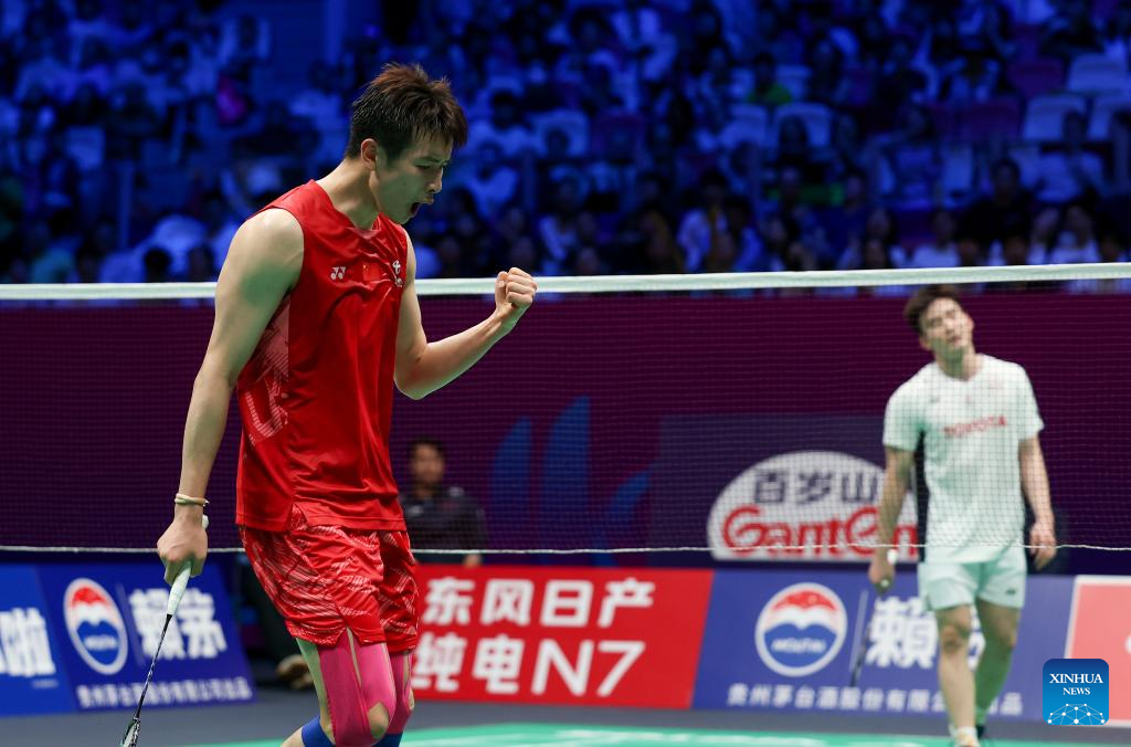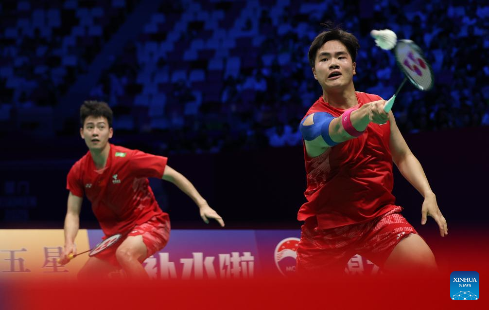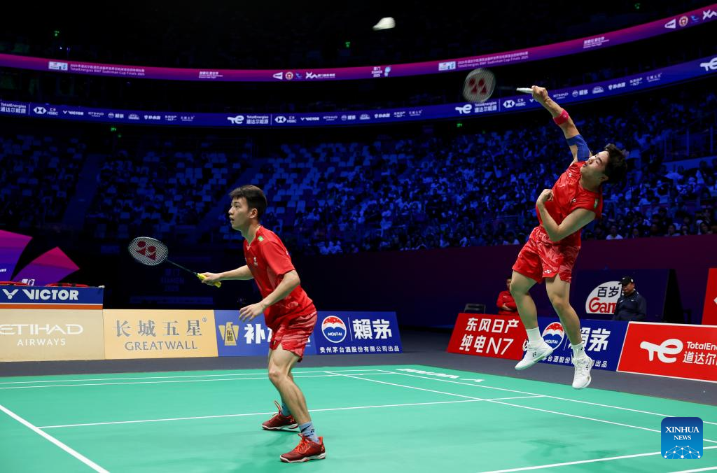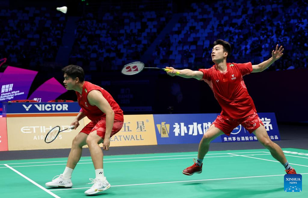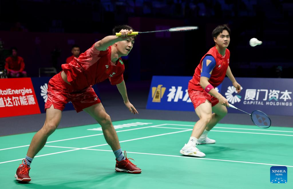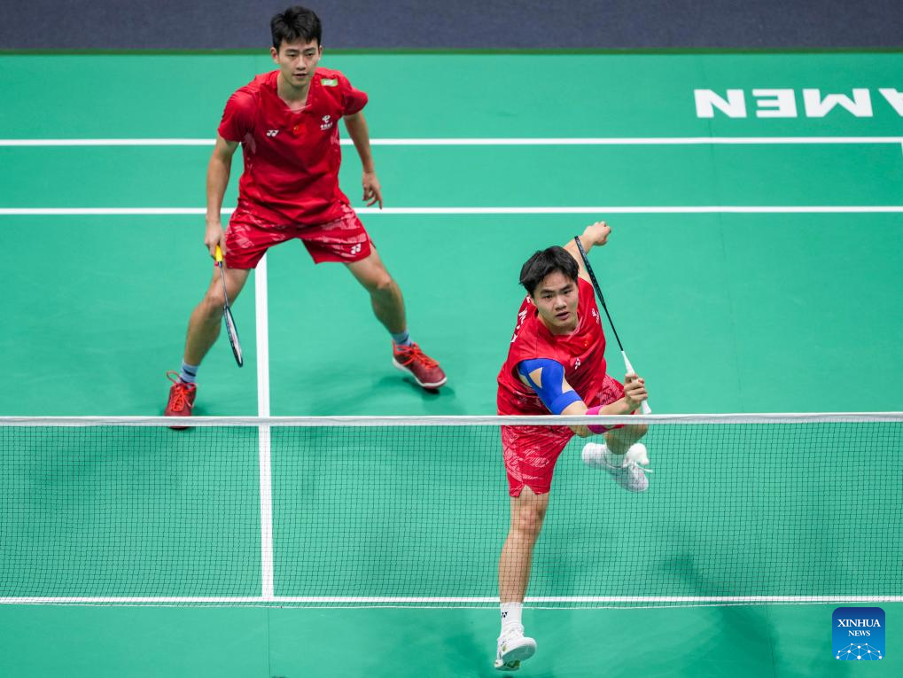 Liang Weikeng/Wang Chang (R) of China compete in the men's doubles match against Supak Jomkoh/Kittinupong Kedren of Thailand during the Group A match between China and Thailand at BWF Sudirman Cup in Xiamen, southeast China's Fujian Province, April 30, 2025. (Xinhua/Sun Fei)