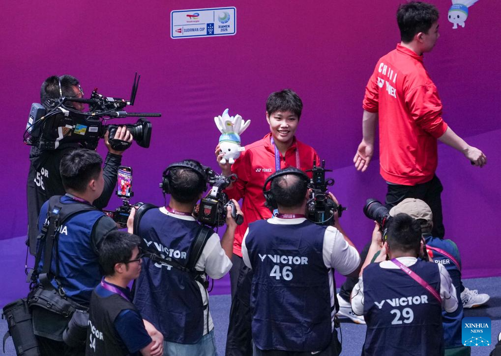 Huang Dongping (C) of China poses with her birthday gift during the Group A match between China and Thailand at BWF Sudirman Cup in Xiamen, southeast China's Fujian Province, April 30, 2025. (Xinhua/Sun Fei)