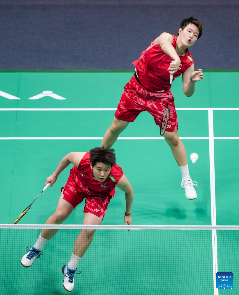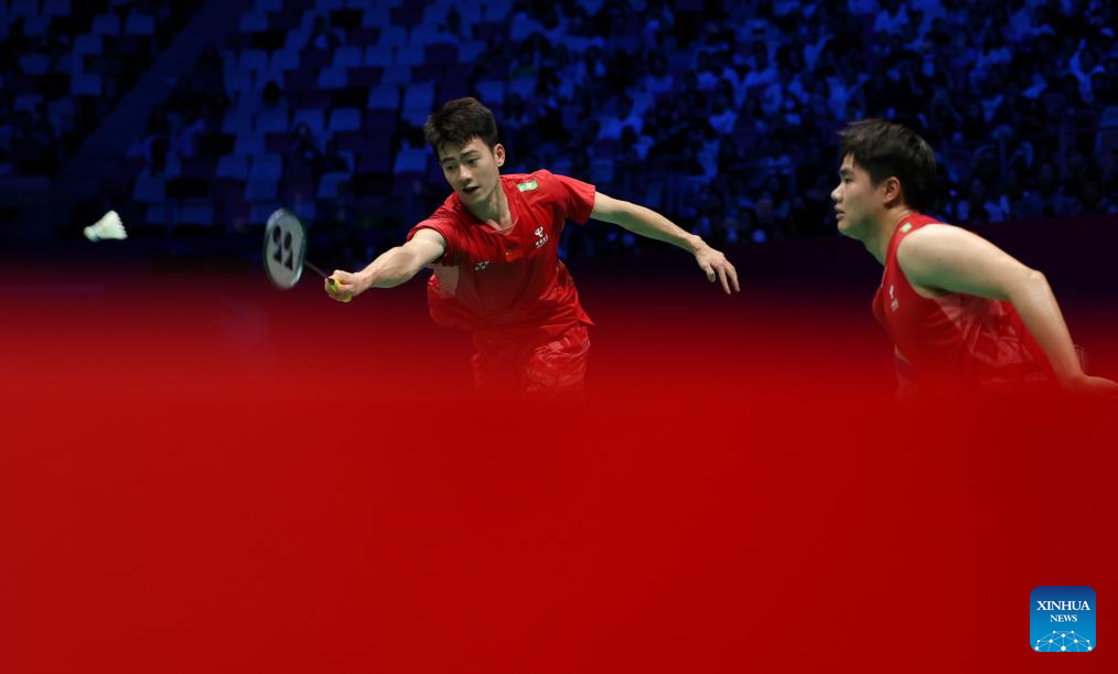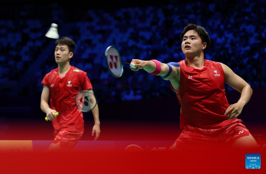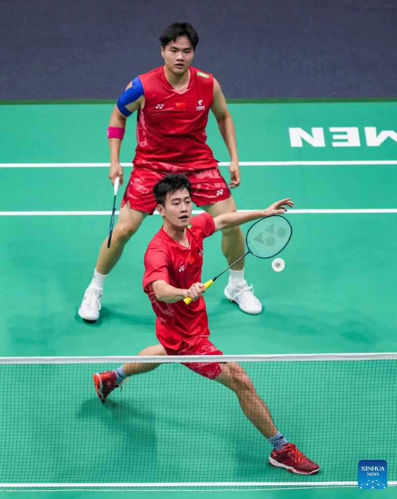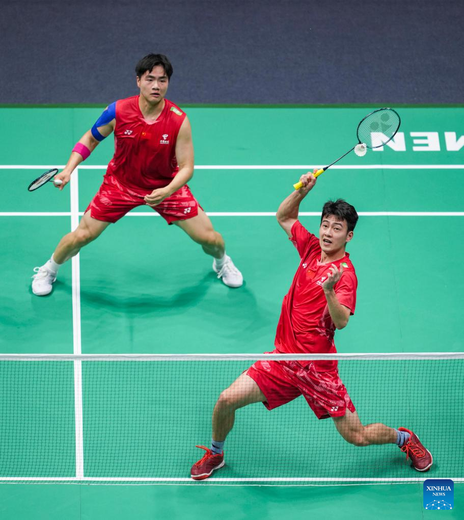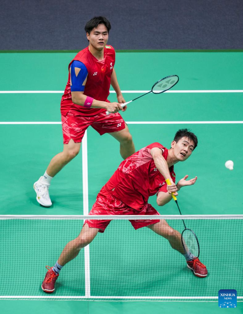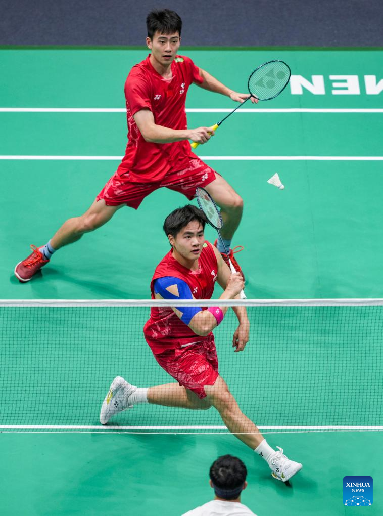 Liang Weikeng (R)/Wang Chang of China compete in the men's doubles match against Supak Jomkoh/Kittinupong Kedren of Thailand during the Group A match between China and Thailand at BWF Sudirman Cup in Xiamen, southeast China's Fujian Province, April 30, 2025. (Xinhua/Sun Fei)