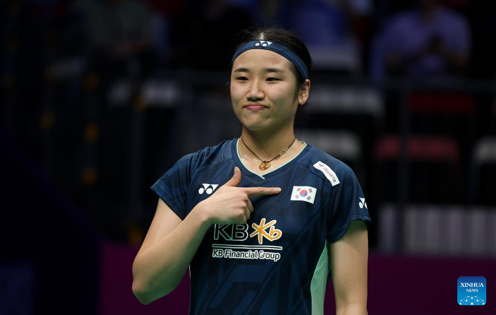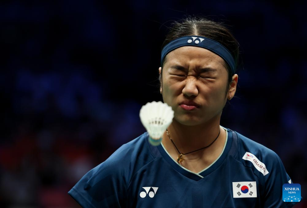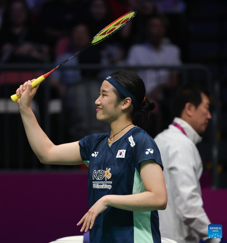 An Se Young of South Korea reacts in the women's singles match against Chiu Pin-Chian of Chinese Taipei during the Group B match between South Korea and Chinese Taipei at BWF Sudirman Cup in Xiamen, southeast China's Fujian Province, April 30, 2025. (Xinhua/Wang Kaiyan)