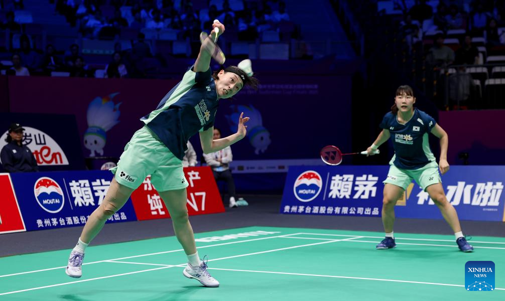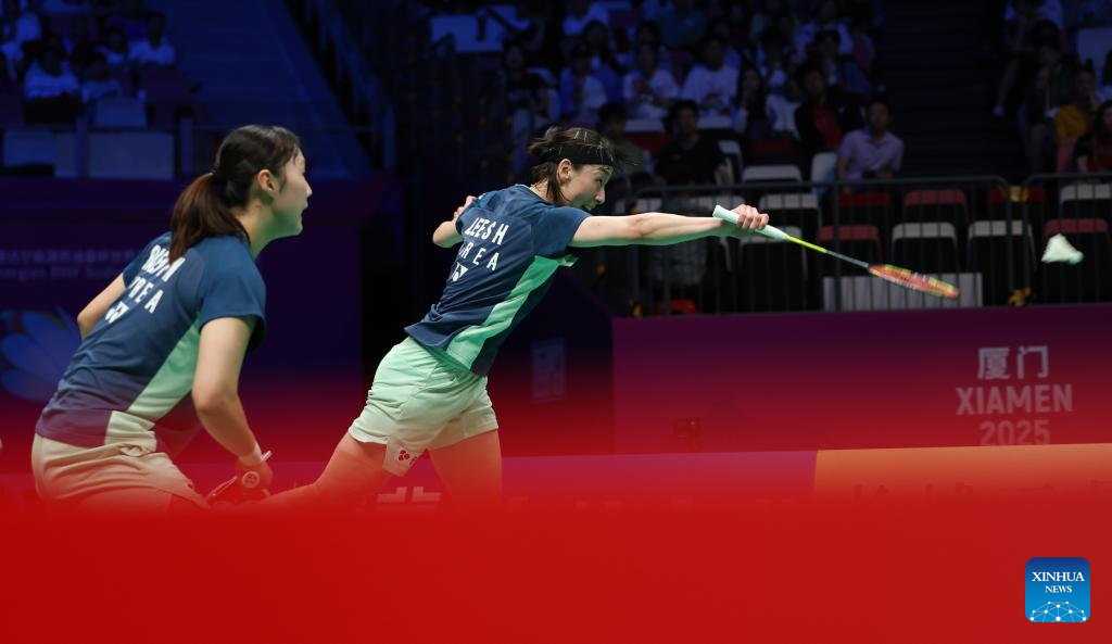 Baek Ha Na/Lee So Hee (L) of South Korea compete in the women's doubles match against Hsieh Pei Shan/Hung En-Tzu of Chinese Taipei during the Group B match between South Korea and Chinese Taipei at BWF Sudirman Cup in Xiamen, southeast China's Fujian Province, April 30, 2025. (Xinhua/Wang Kaiyan)