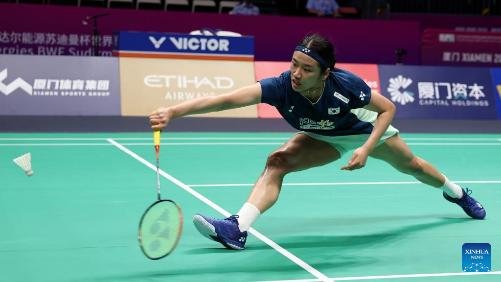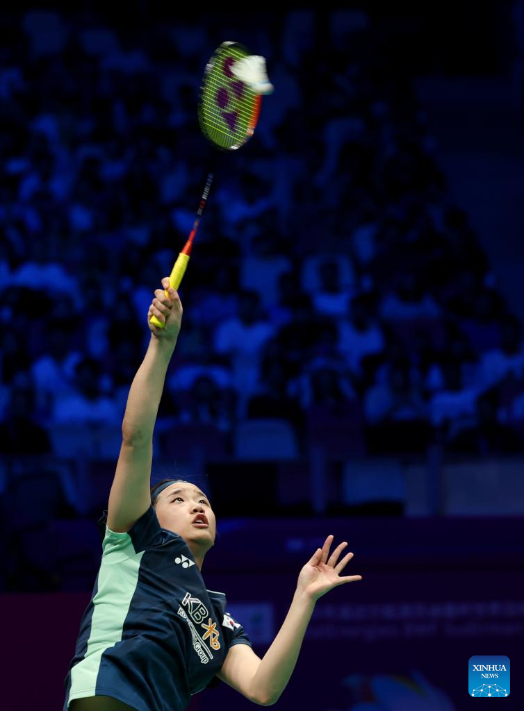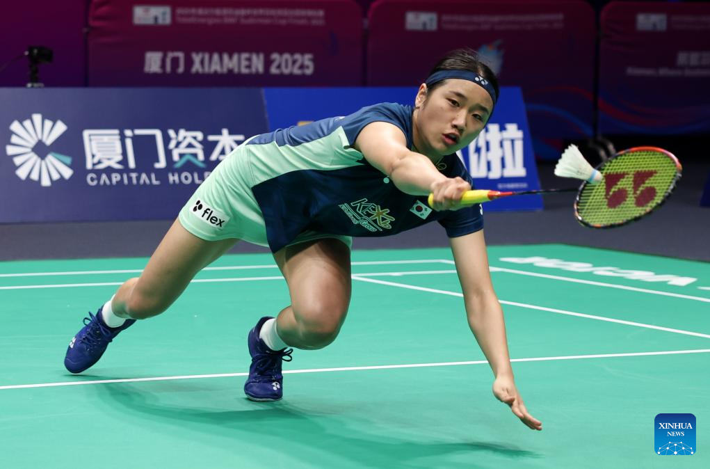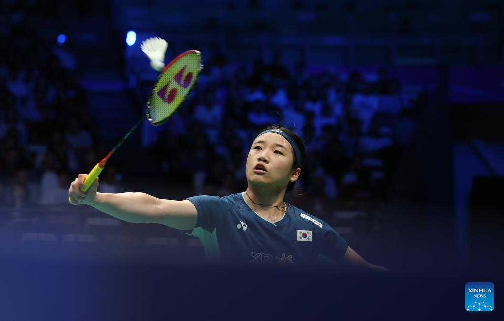 An Se Young of South Korea competes in the women's singles match against Chiu Pin-Chian of Chinese Taipei during the Group B match between South Korea and Chinese Taipei at BWF Sudirman Cup in Xiamen, southeast China's Fujian Province, April 30, 2025. (Xinhua/Wang Kaiyan)