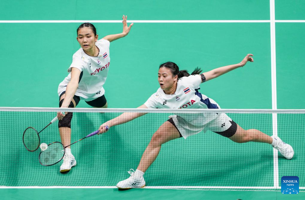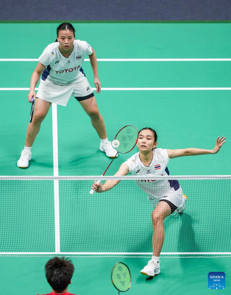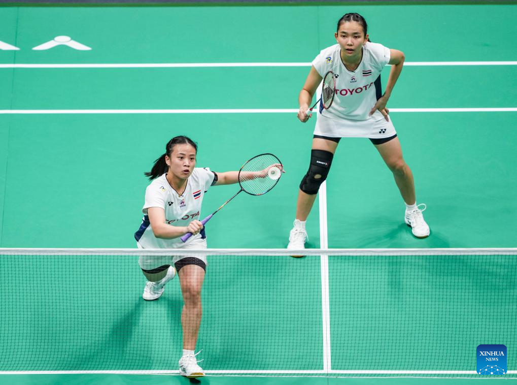 Supissara Paewsampran (L)/Jhenicha Sudjaipraparat of Thailand compete in the women's doubles match against Liu Shengshu/Tan Ning of China during the Group A match between China and Thailand at BWF Sudirman Cup in Xiamen, southeast China's Fujian Province, April 30, 2025. (Xinhua/Sun Fei)