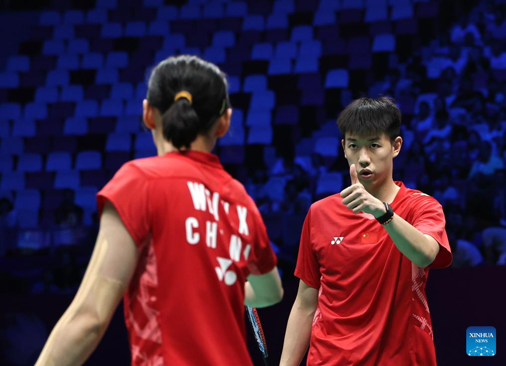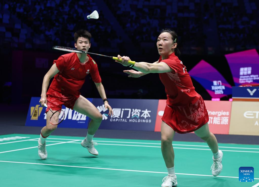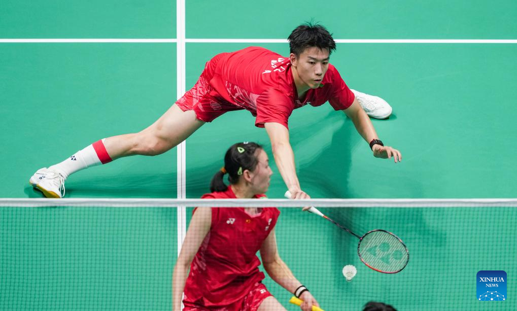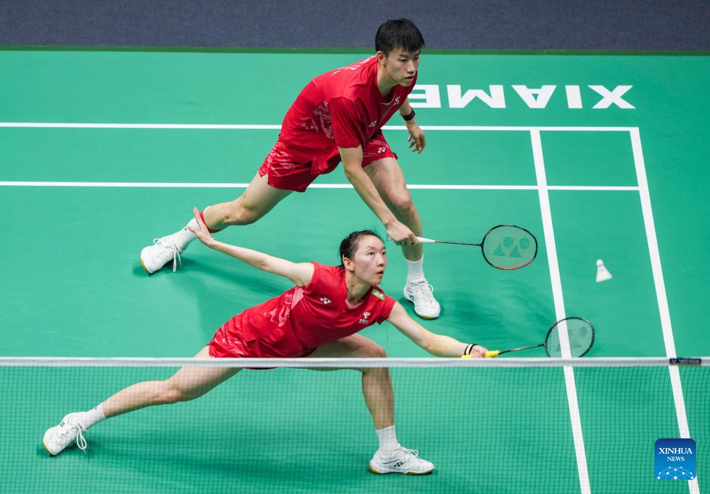 Feng Yanzhe (top)/Wei Yaxin of China compete in the mixed doubles match against Pakkapon Teeraratsakul/Phataimas Muenwong of Thailand during the Group A match between China and Thailand at BWF Sudirman Cup in Xiamen, southeast China's Fujian Province, April 30, 2025. (Xinhua/Sun Fei)