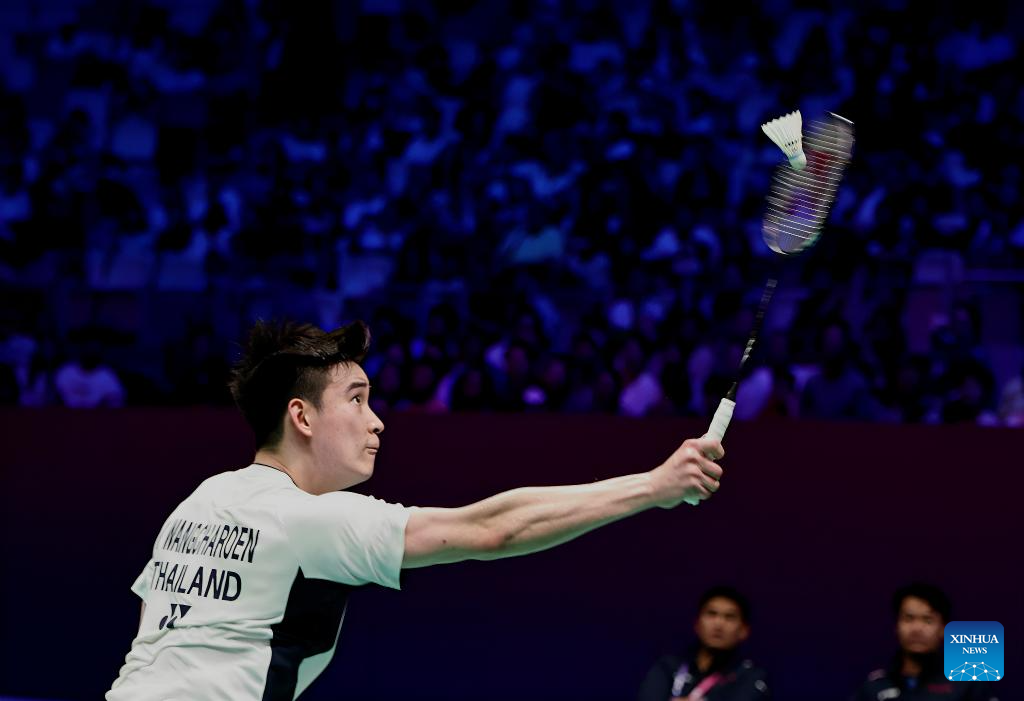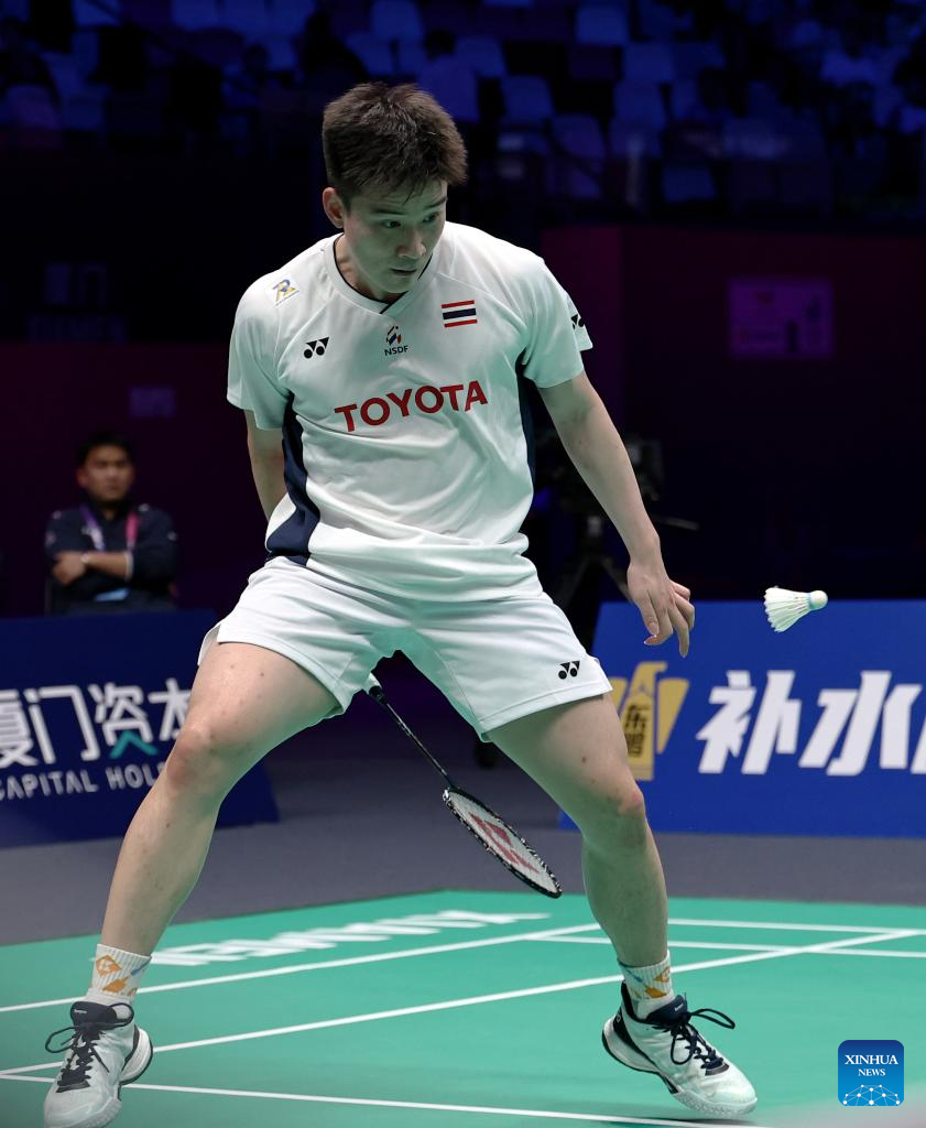 Kantaphon Wangcharoen of Thailand competes in the men's singles match against Li Shifeng of China during the Group A match between China and Thailand at BWF Sudirman Cup in Xiamen, southeast China's Fujian Province, April 30, 2025. (Xinhua/Wei Peiquan)
