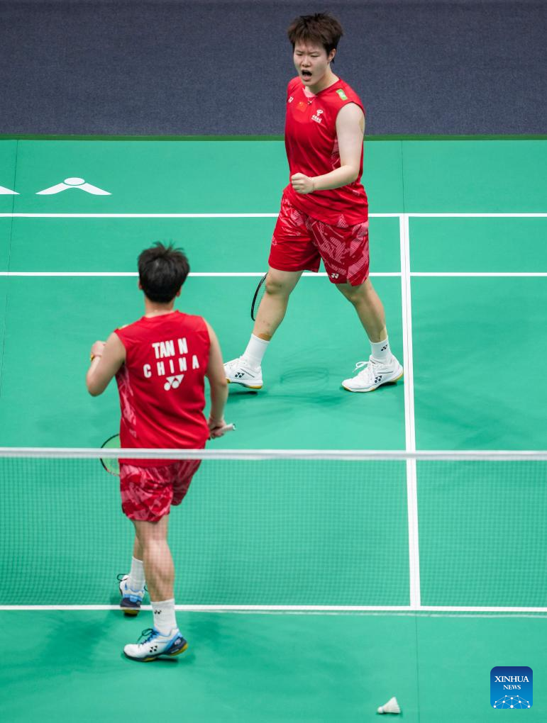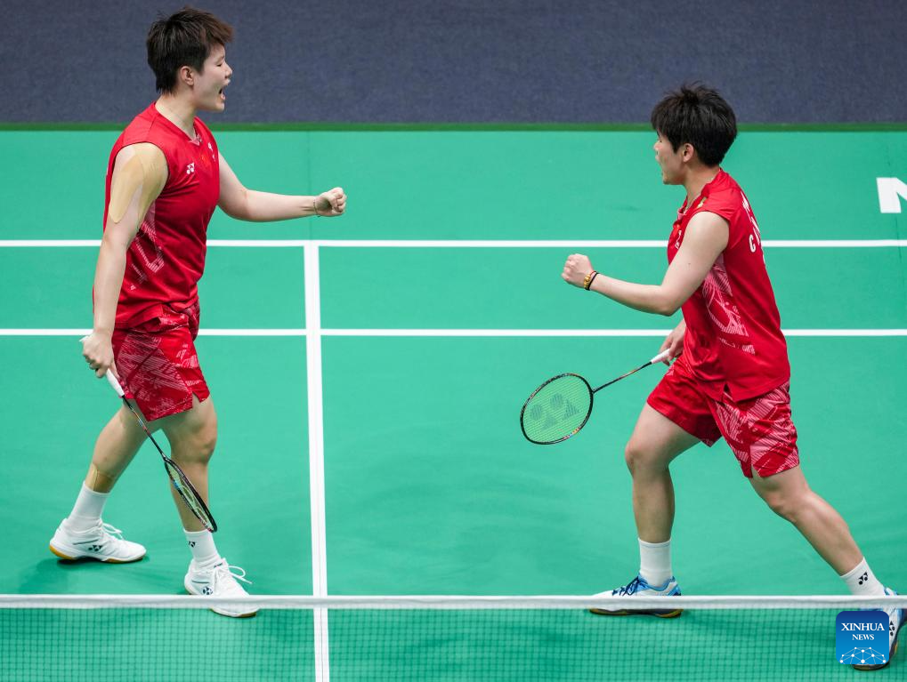 Liu Shengshu (R)/Tan Ning of China celebrate in the women's doubles match against Supissara Paewsampran/Jhenicha Sudjaipraparat of Thailand during the Group A match between China and Thailand at BWF Sudirman Cup in Xiamen, southeast China's Fujian Province, April 30, 2025. (Xinhua/Sun Fei)