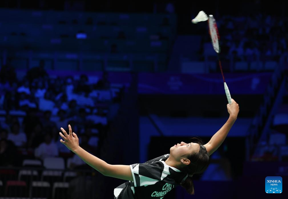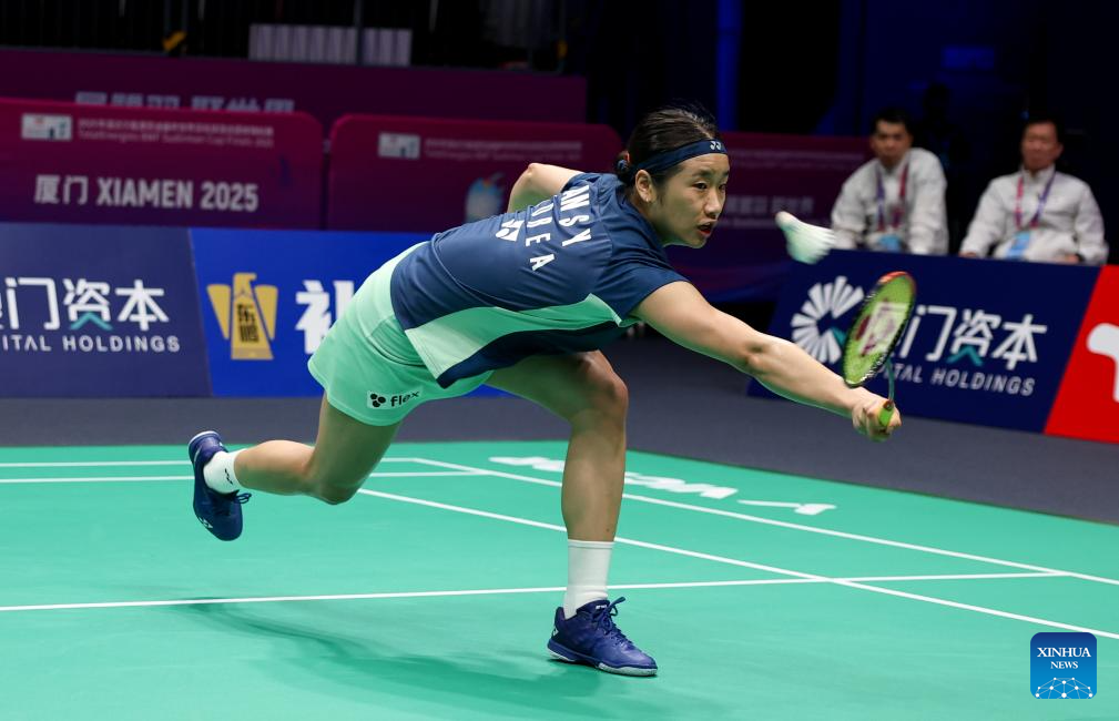 Chiu Pin-Chian of Chinese Taipei competes in the women's singles match against An Se Young of South Korea during the Group B match between South Korea and Chinese Taipei at BWF Sudirman Cup in Xiamen, southeast China's Fujian Province, April 30, 2025. (Xinhua/Wang Kaiyan)