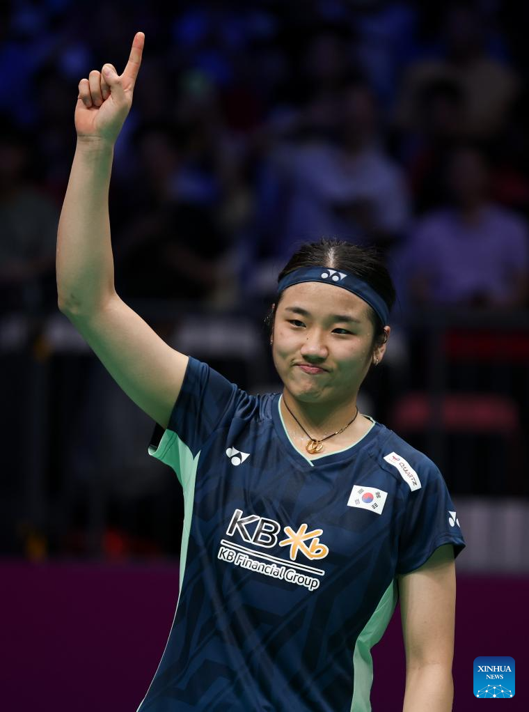 An Se Young of South Korea celebrates after the women's singles match against Chiu Pin-Chian of Chinese Taipei during the Group B match between South Korea and Chinese Taipei at BWF Sudirman Cup in Xiamen, southeast China's Fujian Province, April 30, 2025. (Xinhua/Wang Kaiyan)