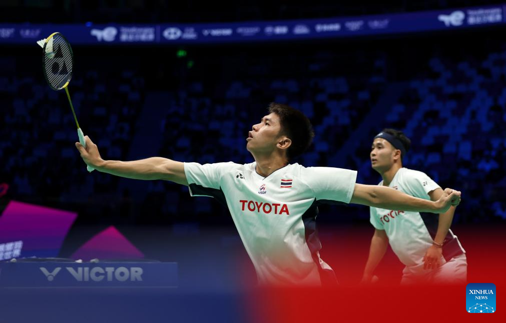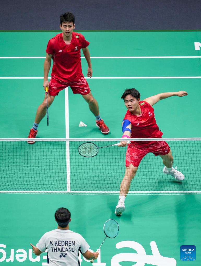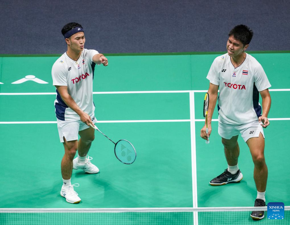 Supak Jomkoh/Kittinupong Kedren (R) of Thailand compete in the men's doubles match against Liang Weikeng/Wang Chang of China during the Group A match between China and Thailand at BWF Sudirman Cup in Xiamen, southeast China's Fujian Province, April 30, 2025. (Xinhua/Sun Fei)