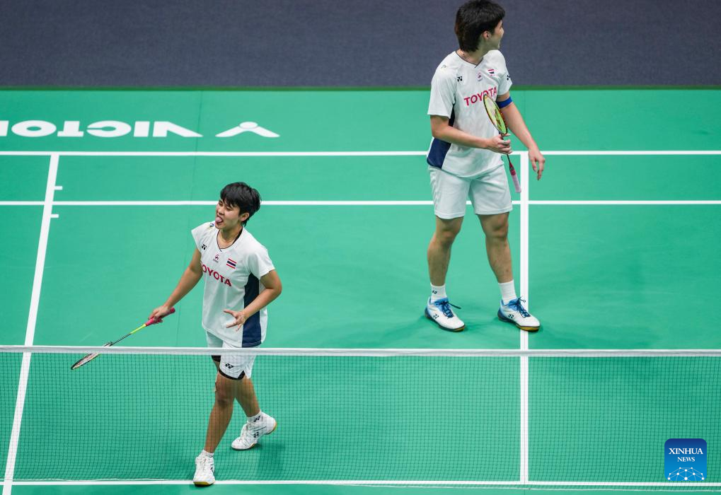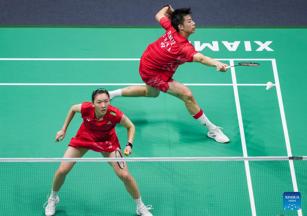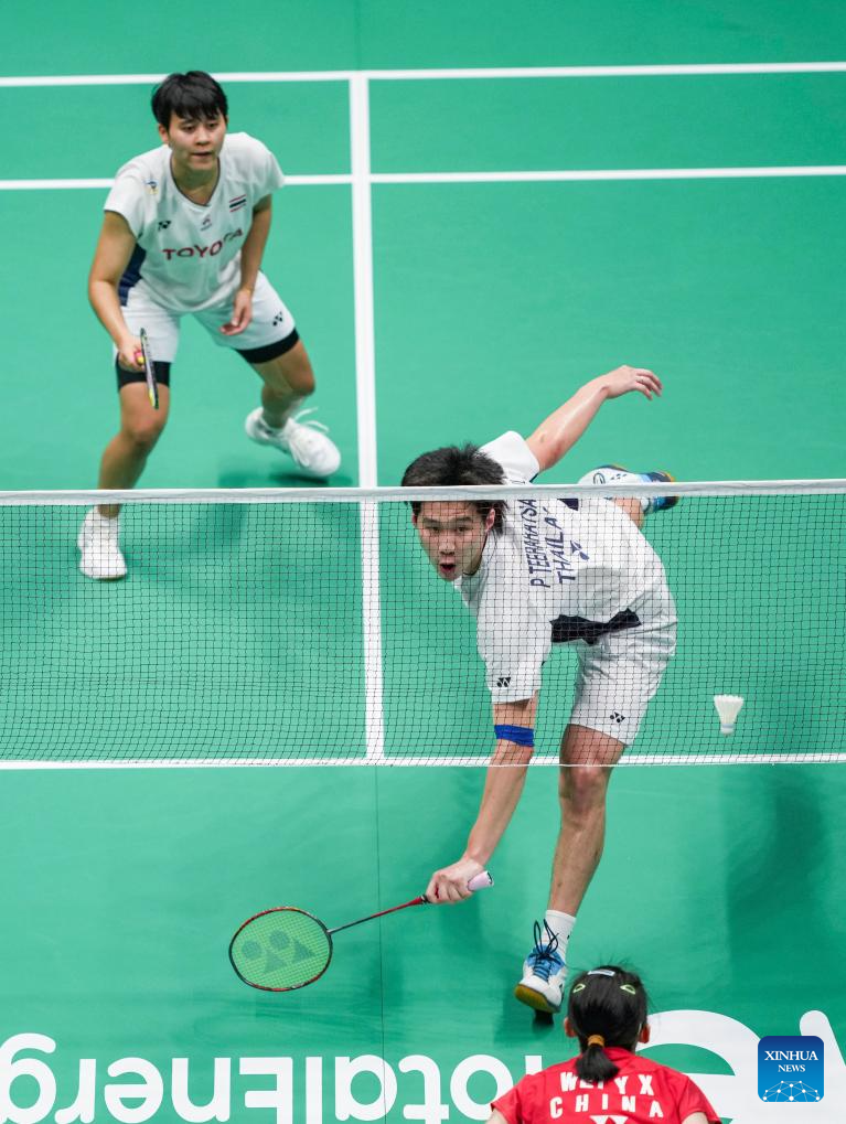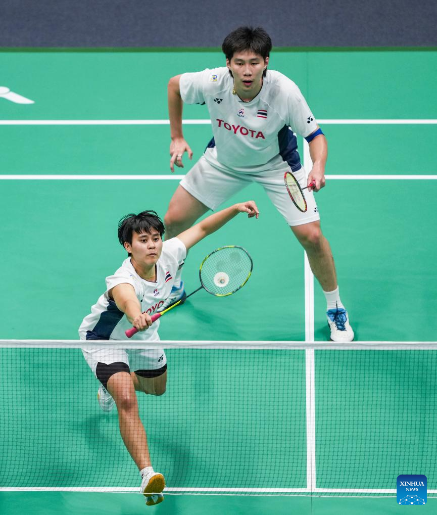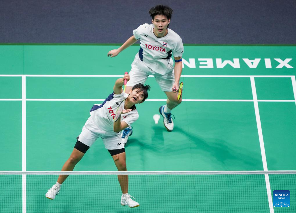Pakkapon Teeraratsaku (R)/Phataimas Muenwong of Thailand compete in the mixed doubles match against Feng Yanzhe/Wei Yaxin of China during the Group A match between China and Thailand at BWF Sudirman Cup in Xiamen, southeast China's Fujian Province, April 30, 2025. (Xinhua/Sun Fei)