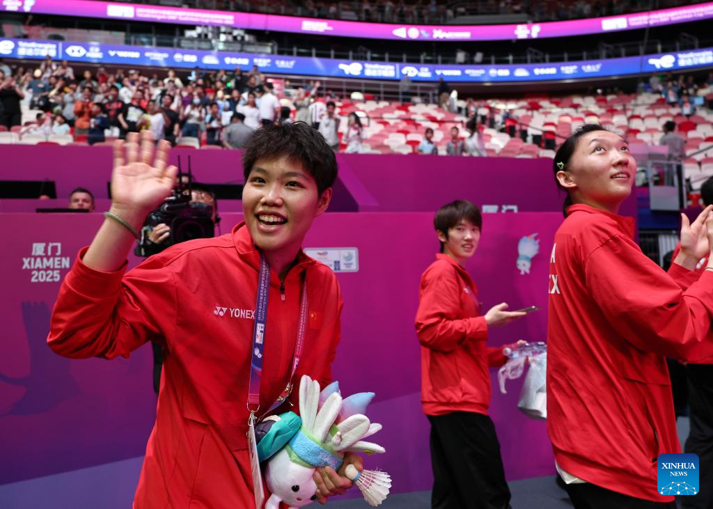 Huang Dongping (L) of China waves to spectators after receiving her birthday gift during the Group A match between China and Thailand at BWF Sudirman Cup in Xiamen, southeast China's Fujian Province, April 30, 2025. (Xinhua/Sun Fei)