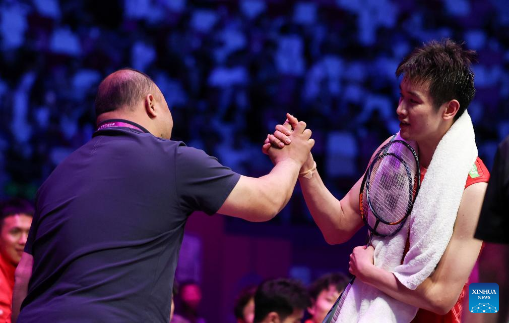 Li Shifeng (R) of China celebrates with Zhang Jun, president of the Chinese Badminton Association, after the men's singles match against Kantaphon Wangcharoen of Thailand during the Group A match between China and Thailand at BWF Sudirman Cup in Xiamen, southeast China's Fujian Province, April 30, 2025. (Xinhua/Wang Kaiyan)