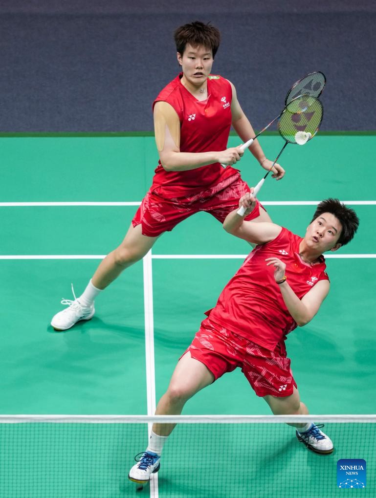 Seo Seung Jae/Chae Yu Jung (R) of South Korea compete in the mixed doubles match against Chen Cheng Kuan/Hsu Yin-Hui of Chinese Taipei during the Group B match between South Korea and Chinese Taipei at BWF Sudirman Cup in Xiamen, southeast China's Fujian Province, April 30, 2025. (Xinhua/Wang Kaiyan)