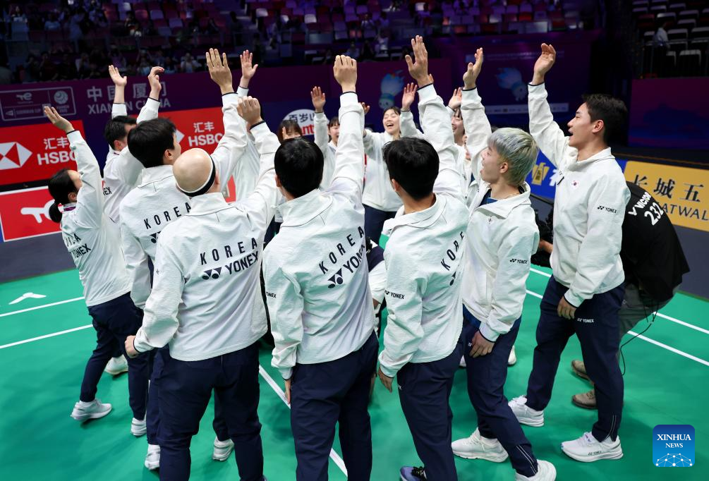 Players of South Korea cheer before the Group B match between South Korea and Chinese Taipei at BWF Sudirman Cup in Xiamen, southeast China's Fujian Province, April 30, 2025. (Xinhua/Wang Kaiyan)