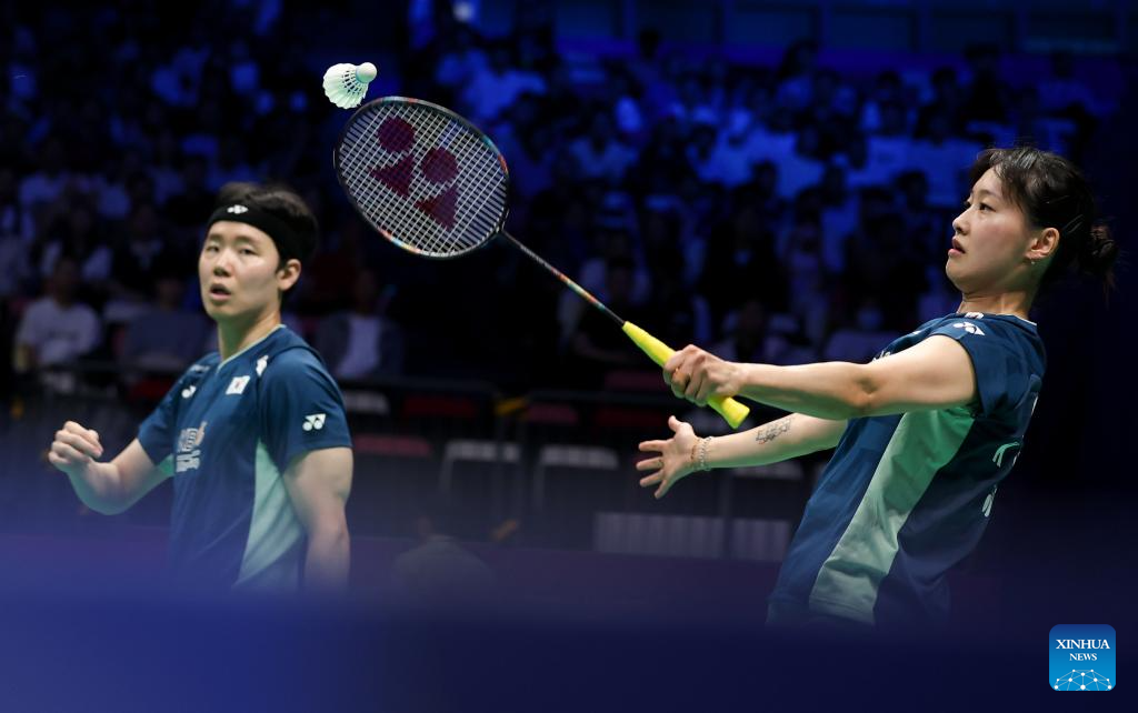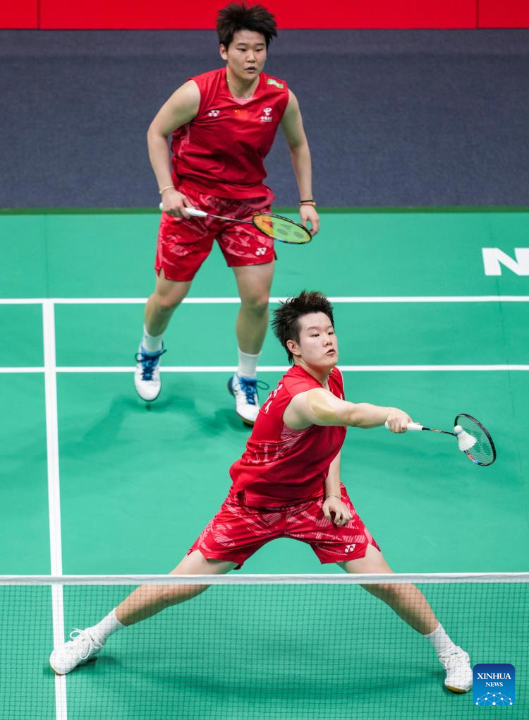 Liu Shengshu (top)/Tan Ning of China compete in the women's doubles match against Supissara Paewsampran/Jhenicha Sudjaipraparat of Thailand during the Group A match between China and Thailand at BWF Sudirman Cup in Xiamen, southeast China's Fujian Province, April 30, 2025. (Xinhua/Sun Fei)