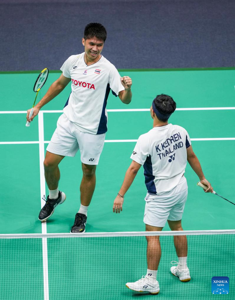 Supak Jomkoh (L)/Kittinupong Kedren of Thailand celebrate in the men's doubles match against Liang Weikeng/Wang Chang of China during the Group A match between China and Thailand at BWF Sudirman Cup in Xiamen, southeast China's Fujian Province, April 30, 2025. (Xinhua/Sun Fei)