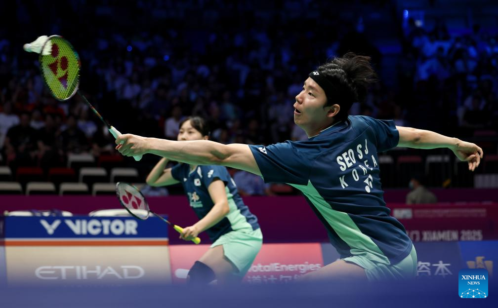 Baek Ha Na/Lee So Hee (R) of South Korea compete in the women's doubles match against Hsieh Pei Shan/Hung En-Tzu of Chinese Taipei during the Group B match between South Korea and Chinese Taipei at BWF Sudirman Cup in Xiamen, southeast China's Fujian Province, April 30, 2025. (Xinhua/Wang Kaiyan)