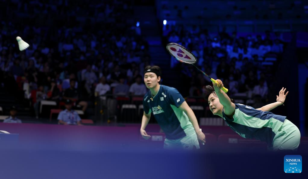 Seo Seung Jae (R)/Chae Yu Jung of South Korea compete in the mixed doubles match against Chen Cheng Kuan/Hsu Yin-Hui of Chinese Taipei during the Group B match between South Korea and Chinese Taipei at BWF Sudirman Cup in Xiamen, southeast China's Fujian Province, April 30, 2025. (Xinhua/Wang Kaiyan)