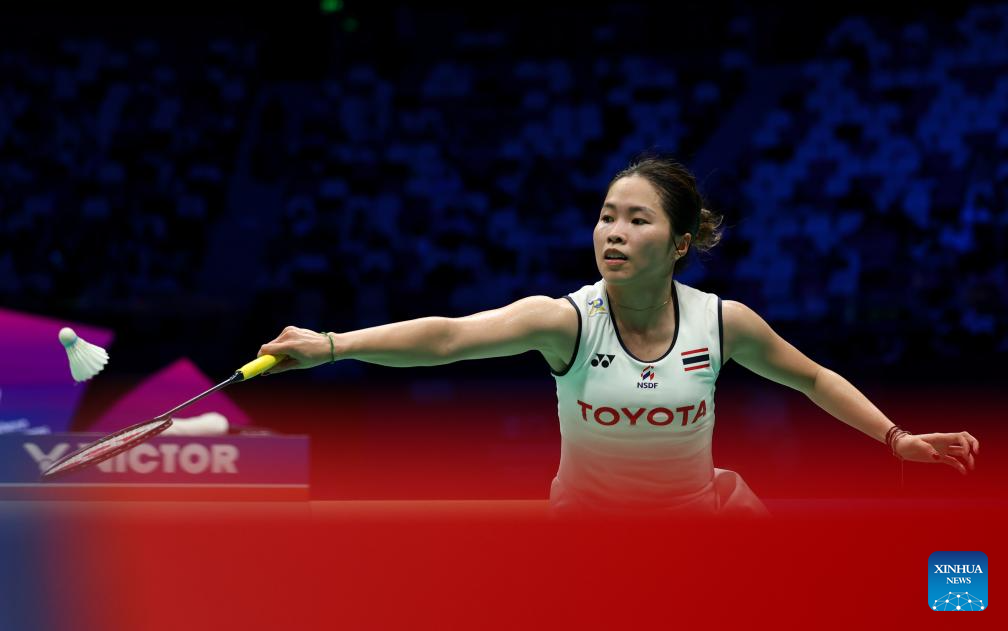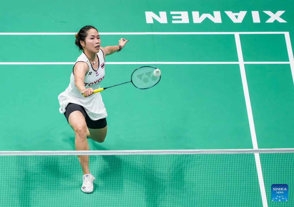 Ratchanok Intanon of Thailand competes in the women's singles match against Wang Zhiyi of China during the Group A match between China and Thailand at BWF Sudirman Cup in Xiamen, southeast China's Fujian Province, April 30, 2025. (Xinhua/Wang Kaiyan)