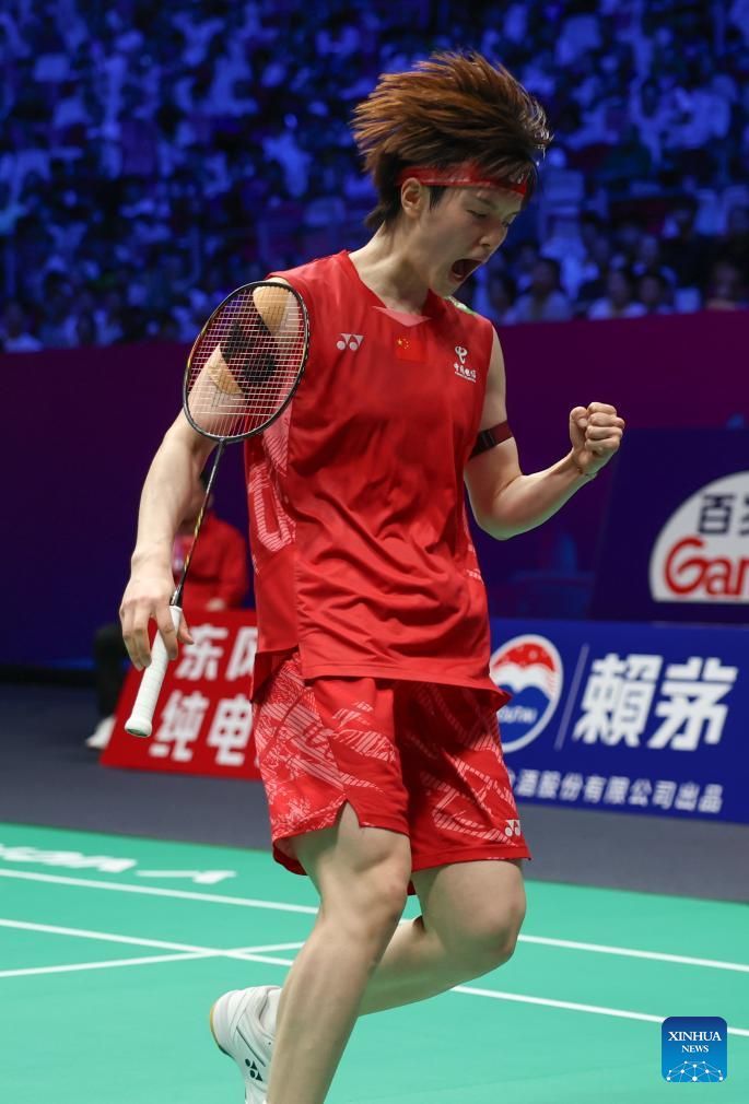 Wang Zhiyi of China reacts in the women's singles match against Ratchanok Intanon of Thailand during the Group A match between China and Thailand at BWF Sudirman Cup in Xiamen, southeast China's Fujian Province, April 30, 2025. (Xinhua/Sun Fei)