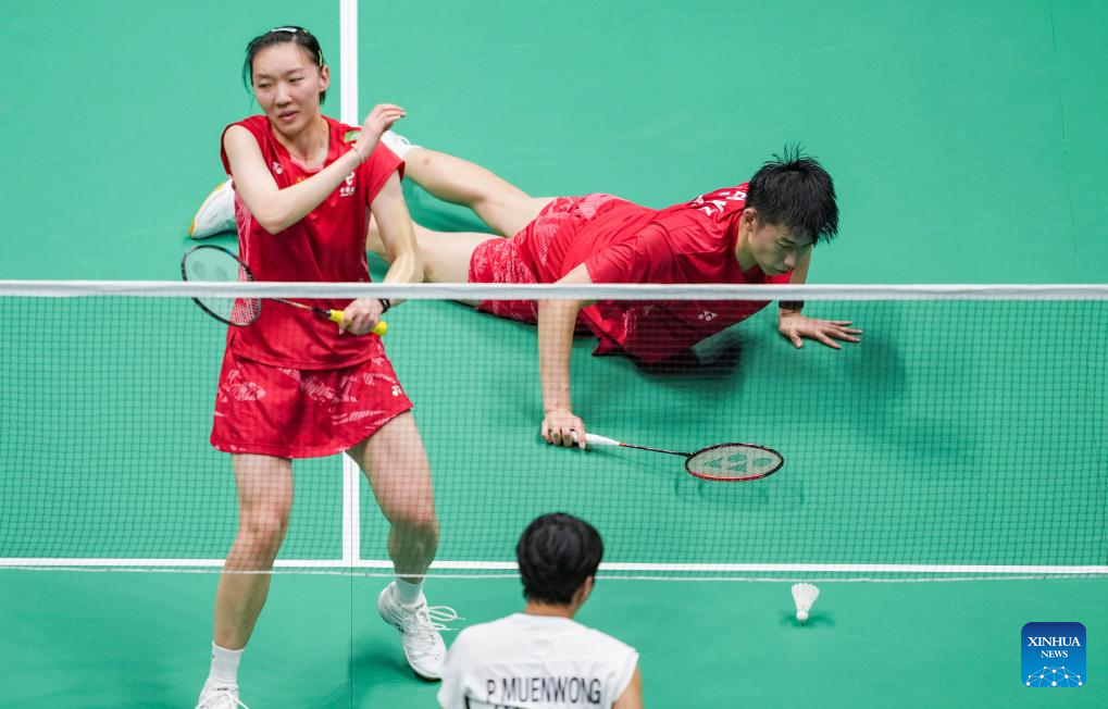 Pakkapon Teeraratsaku/Phataimas Muenwong (below) of Thailand compete in the mixed doubles match against Feng Yanzhe/Wei Yaxin of China during the Group A match between China and Thailand at BWF Sudirman Cup in Xiamen, southeast China's Fujian Province, April 30, 2025. (Xinhua/Sun Fei)