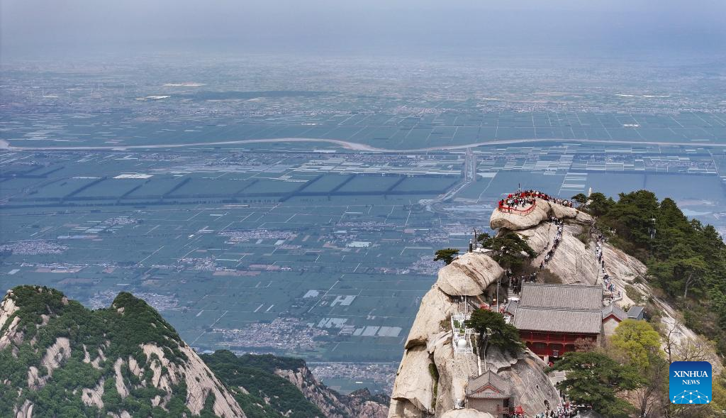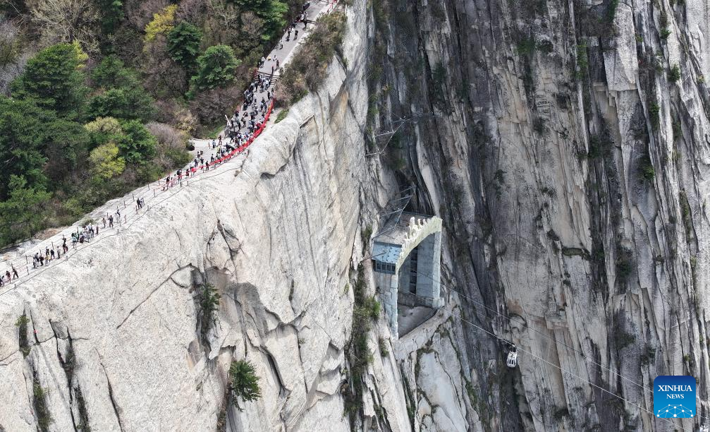 An aerial drone photo taken on April 29, 2025 shows tourists visiting the Huashan Mountain scenic area in Weinan, northwest China's Shaanxi Province. Boasting precipitous cliffs and beautiful scenery, the Huashan Mountain has attracted a great number of visitors from around the world. With a maximal elevation difference of nearly 900 meters, the mountain's 4,211-meter-long sightseeing cableway has provided an unique travelling experience for tourists and gained popularity since its launch in 2013. For the smooth operation of the cableway, inspection of mechanical parts, electrical systems and communication equipment have become the routine work of maintenance workers every single day. As about 150,000 visits are expected to be made to Huashan during the upcoming May Day holiday, a total of 30 maintenance workers will be on duty to ensure the safe operation of the cableway. (Xinhua/Zhang Bowen)