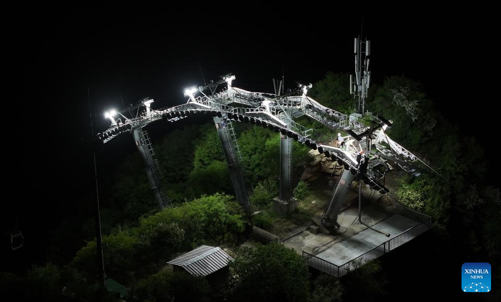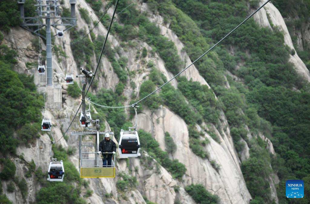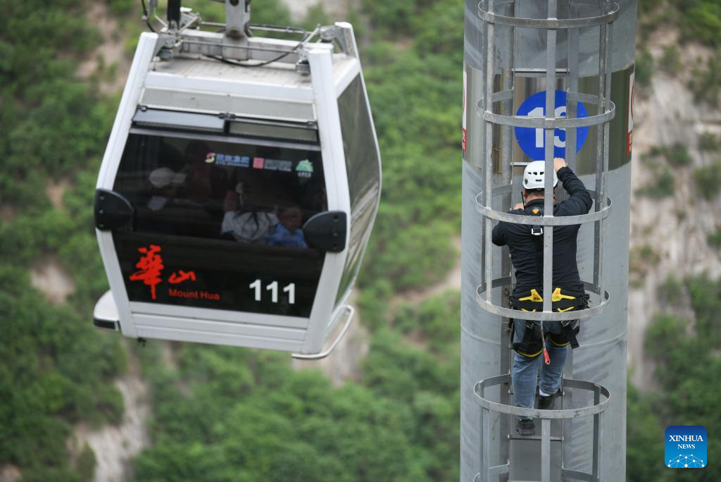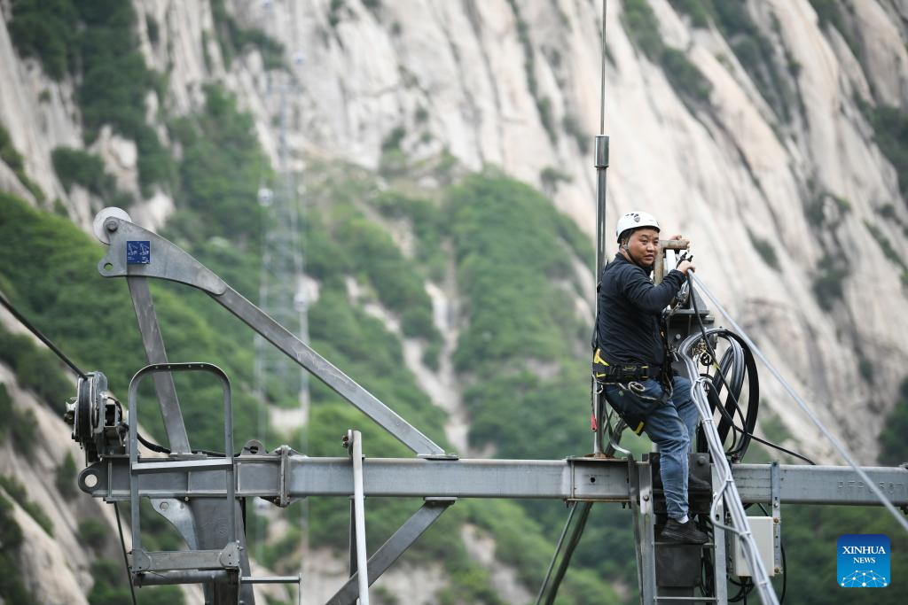 A maintenance worker conducts routine inspection on the sightseeing cableway at the Huashan Mountain scenic area in Weinan, northwest China's Shaanxi Province, April 29, 2025. Boasting precipitous cliffs and beautiful scenery, the Huashan Mountain has attracted a great number of visitors from around the world. With a maximal elevation difference of nearly 900 meters, the mountain's 4,211-meter-long sightseeing cableway has provided an unique travelling experience for tourists and gained popularity since its launch in 2013. For the smooth operation of the cableway, inspection of mechanical parts, electrical systems and communication equipment have become the routine work of maintenance workers every single day. As about 150,000 visits are expected to be made to Huashan during the upcoming May Day holiday, a total of 30 maintenance workers will be on duty to ensure the safe operation of the cableway. (Xinhua/Zhang Bowen)