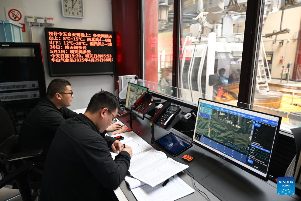 Maintenance workers monitor the operation of the sightseeing cableway at a cable car station at the Huashan Mountain scenic area in Weinan, northwest China's Shaanxi Province, April 29, 2025. Boasting precipitous cliffs and beautiful scenery, the Huashan Mountain has attracted a great number of visitors from around the world. With a maximal elevation difference of nearly 900 meters, the mountain's 4,211-meter-long sightseeing cableway has provided an unique travelling experience for tourists and gained popularity since its launch in 2013. For the smooth operation of the cableway, inspection of mechanical parts, electrical systems and communication equipment have become the routine work of maintenance workers every single day. As about 150,000 visits are expected to be made to Huashan during the upcoming May Day holiday, a total of 30 maintenance workers will be on duty to ensure the safe operation of the cableway. (Xinhua/Zhang Bowen)
