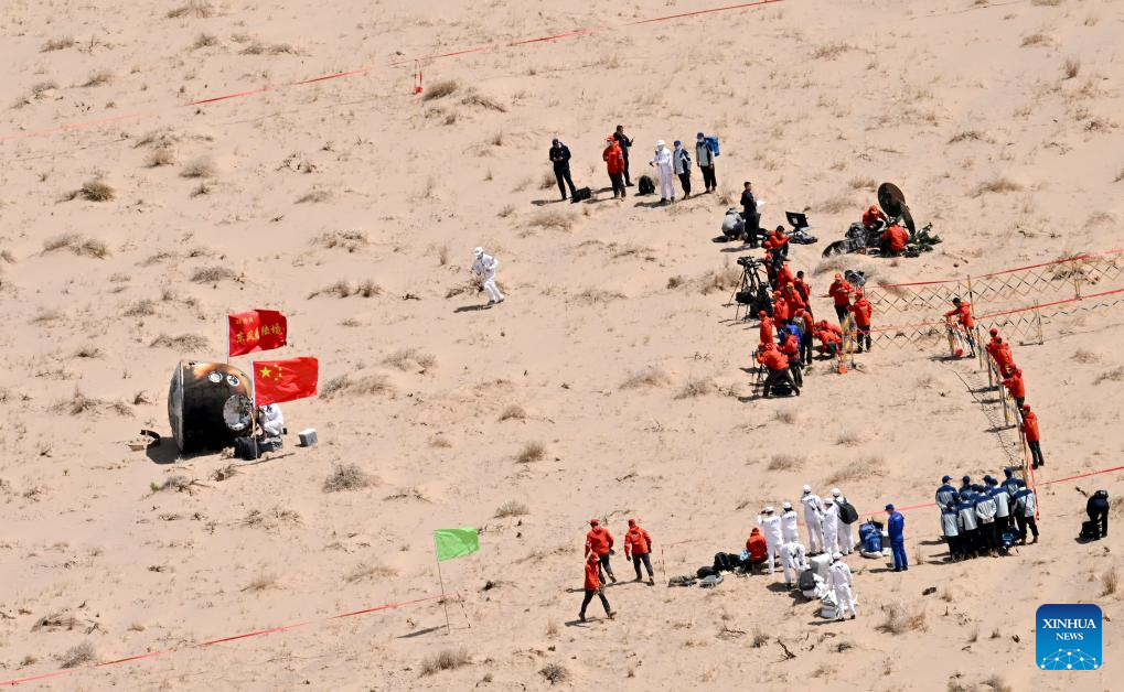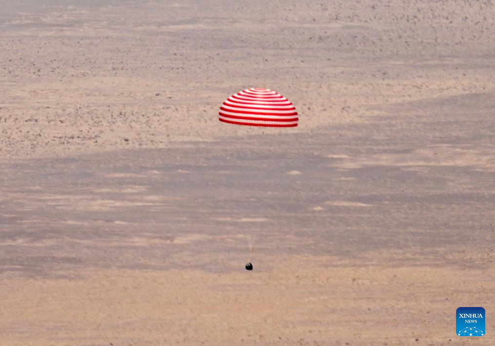 JIUQUAN, April 30 (Xinhua) -- The return capsule of the Shenzhou-19 crewed spaceship, carrying astronauts Cai Xuzhe, Song Lingdong and Wang Haoze, touched down at the Dongfeng landing site in north China's Inner Mongolia Autonomous Region on Wednesday.
