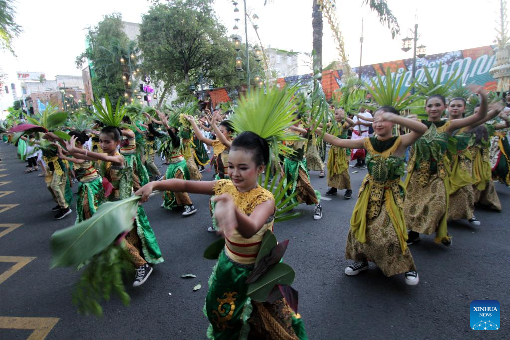 (250429) -- SURAKARTA, April 29, 2025 (Xinhua) -- Dancers participate in Solo Dance Festival 2025 to celebrate International Dance Day in Surakarta, Central Java, Indonesia, April 29, 2025. (Photo by Bram Selo/Xinhua)