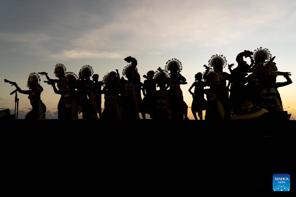People watch as artists perform the traditional Balinese Janger dance to celebrate International Dance Day at Pererenan Beach in Badung Regency, Bali, Indonesia, April 29, 2025. (Photo by Dicky Bisinglasi/Xinhua)