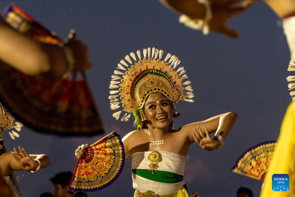 An artist performs the traditional Balinese Janger dance to celebrate International Dance Day at Pererenan Beach in Badung Regency, Bali, Indonesia, April 29, 2025. (Photo by Dicky Bisinglasi/Xinhua)