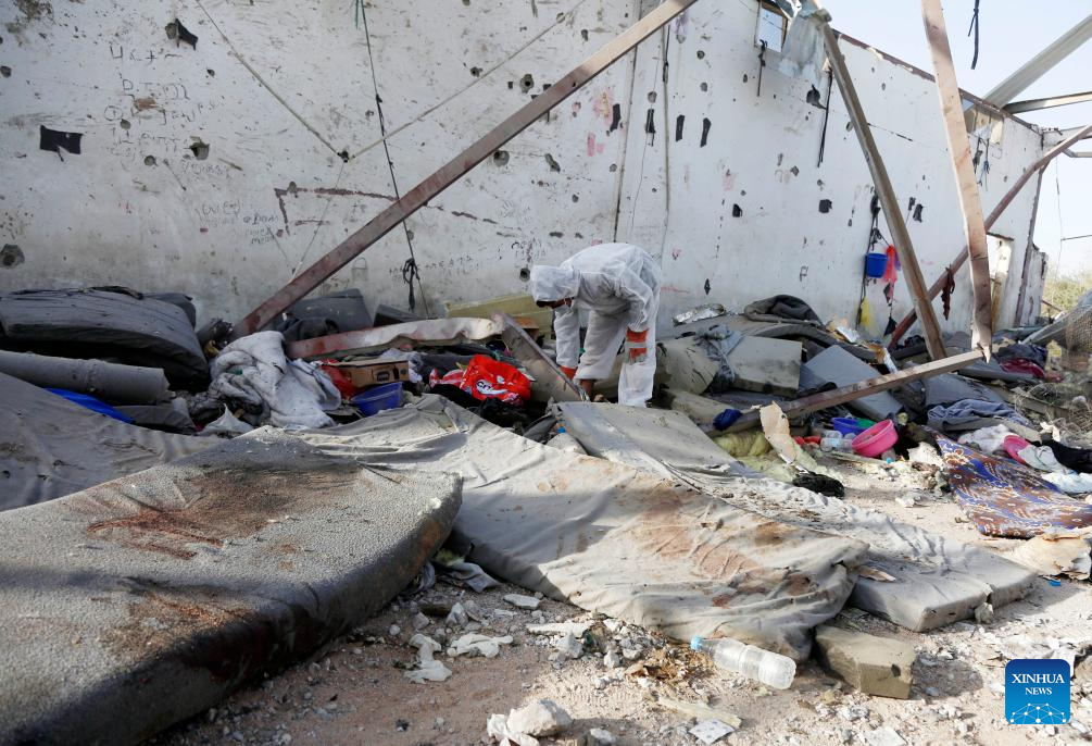 An investigator collects evidence among rubble of the migrant center destroyed in U.S. airstrikes in Saada province, Yemen, April 28, 2025. Casualties from U.S. dawn strikes on a migrant center in the northern province of Saada have risen to 68, according to the Houthi-run al-Masirah TV. (Photo by Mohammed Mohammed/Xinhua)