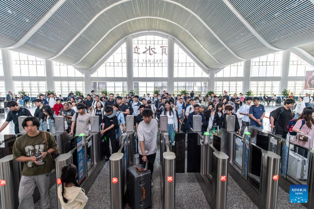 Passengers check in at Lishui Railway Station in Lishui City, east China's Zhejiang Province, April 29, 2025. China's railway network is expected to handle approximately 144 million passenger trips during the May Day holiday travel rush, which kicked off on Tuesday, the national railway operator said. (Photo by Hu Xiaofei/Xinhua)