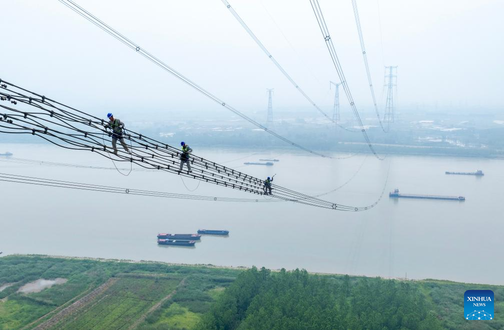 An aerial drone photo taken on April 29, 2025 shows employees of a power project company checking wires at a height of 200 meters near the Yangtze River in Gaogou Town, Wuwei City of east China's Anhui Province. (Xinhua/Zhou Mu)
