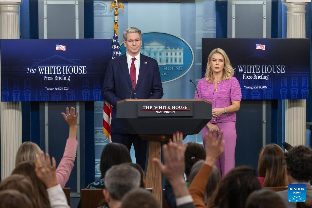White House Press Secretary Karoline Leavitt (R, Rear) holds a press briefing alongside U.S. Treasury Secretary Scott Bessent (L, Rear) at the White House in Washington, D.C., the United States, on April 29, 2025. The White House has criticized retail giant Amazon's decision to display tariff costs alongside the price of its products. Responding to a report of the planned Amazon move, White House Press Secretary Karoline Leavitt on Tuesday called the move a "hostile and political act." She made the remark during a press briefing with Treasury Secretary Scott Bessent. (Xinhua/Hu Yousong)