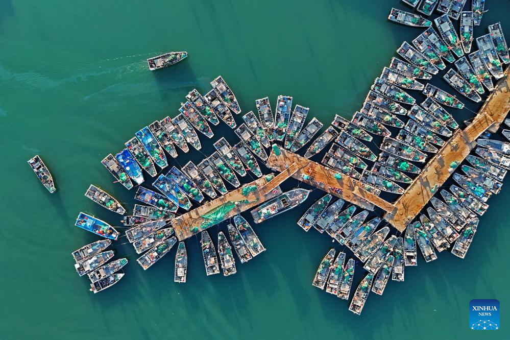 A drone photo taken on April 28, 2025 shows fishing boats returning to a fishing port before a fishing ban in Yantai City, east China's Shandong Province. (Photo by Sun Wentan/Xinhua)